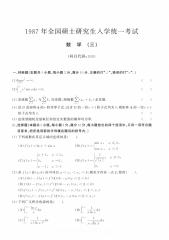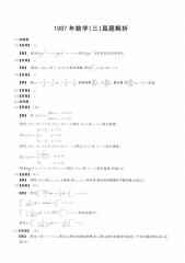 1987年数学(三)真题解析一、判断题(1)【答案】X._1__1_丄【解】因为lime7=0,lime7=所以lime〒不存在但不是无穷大.r-0_h~o+乂~°(2)【答案】J.【解】因为J:4sinx为[―兀,兀]上的奇函数,所以Jsinzdz=0.(3)【答案】X.【解】取Q”=—~\-----,6“=-y9显然级数工Q”与〉2九都发散,但工(5+〃”)收敛.刃〃77”=1”=】”=1(4)【答案】J.(5)【答案】J.二、选择题(1)【答案】(A).(sinx,乂W0,【解】对于(工)=〔cosx,无〉0,因为/(0—0)=0H/(0+0)=1,所以/(J:)在工=0处不连续;卜+1...
